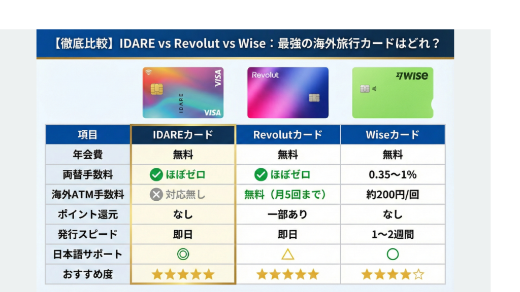 | 項目 | IDAREカード | Revolutカード | Wiseカード | クレジットカード |