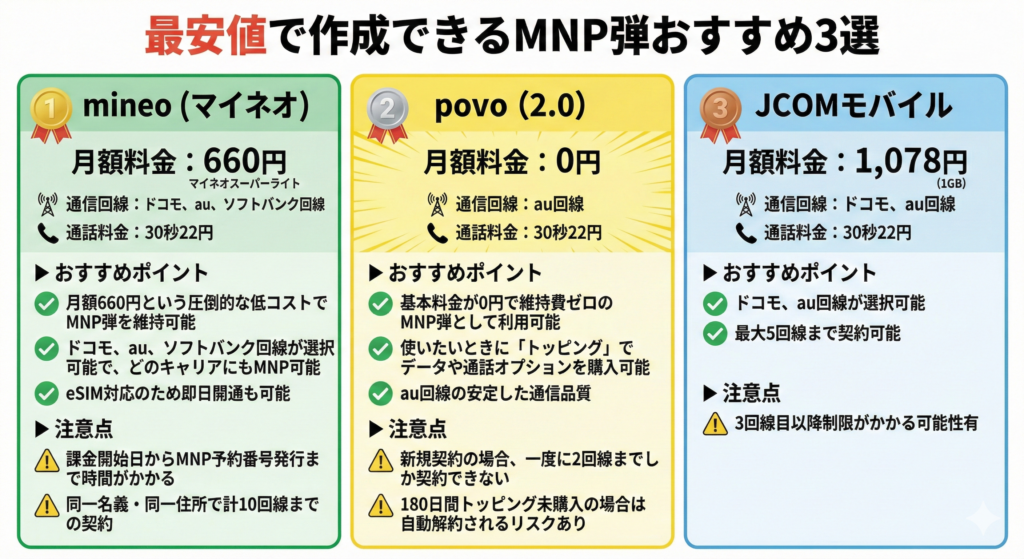 【2026年最新版】最安値で作成できるMNP弾おすすめ3選 (mineo、povo2.0、JCOMモバイル)