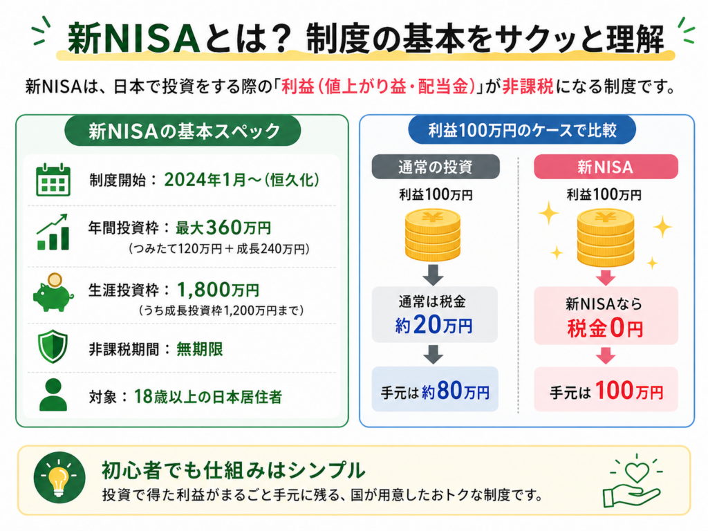 新NISA(少額投資非課税制度)は、2024年1月に旧NISAから大幅リニューアルされた制度です。最大の特徴は、投資で得た利益に税金がかからないこと。通常、投資の利益には約20.315%の税金がかかりますが、新NISAを使えばこれがゼロになります。
