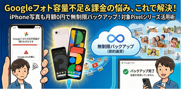 【Googleフォト】容量不足は「中古のPixel」で解決!iPhoneの写真を無制限バックアップする裏技と画質検証