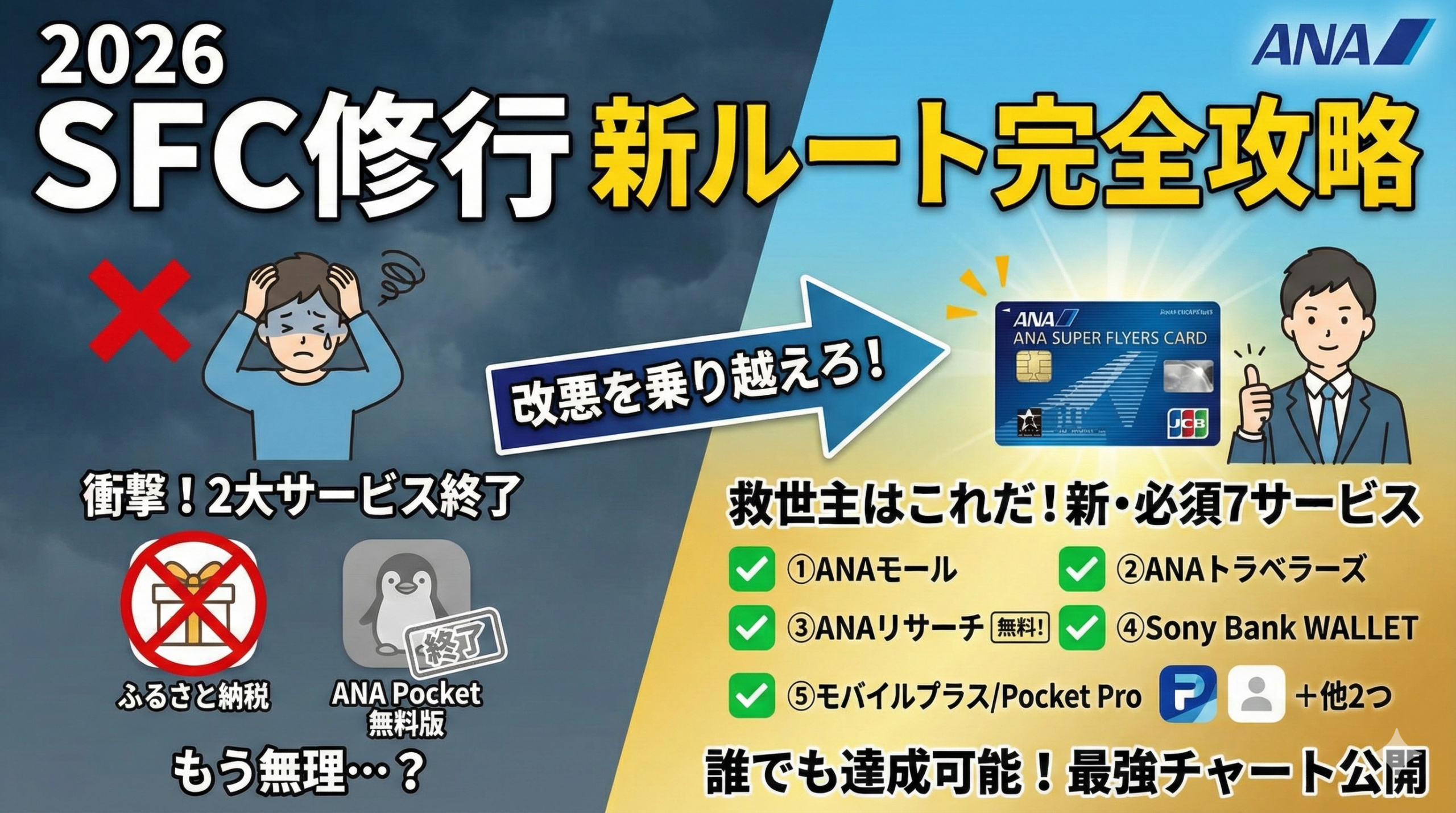 その通り。実は2026年の修行から、これまで頼みの綱だった「ANA Pocket(通称:ペンギン)/無料版」と「ANAふるさと納税」が使えなくなるという、衝撃的なルール変更があるんです。