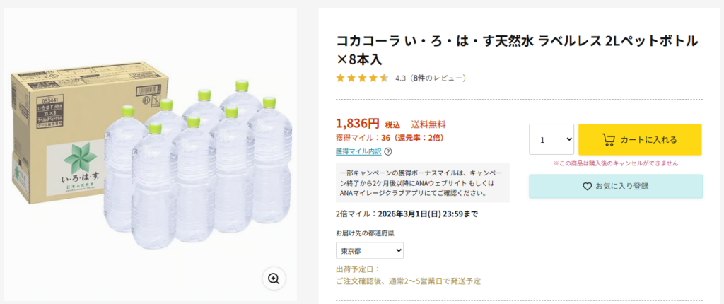 ネットショッピングで必須2つを達成 ANAモール で水や日用品を購入する(1,000円〜)。